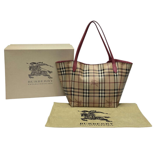 Bolsa Burberry Haymarket Check Tote. O modelo é confeccionado em canvas com estampa no tradicional xadrez da marca e acabamentos em couro na cor rosa. O modelo traz ferragens douradas, duas alças de ombros, compartimento único interno e fechamento por botão.