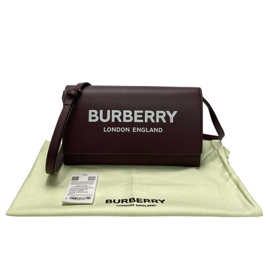 Bolsa Burberry Hazelmere confeccionada em couro na cor vinho. O modelo de formato retangular traz alça longa ajustável e removível por mosquetão - o que possibilita seu uso como clutch -, ferragens douradas, fechamento por aba com botão de pressão e três compartimentos internos, sendo o central com zíper.