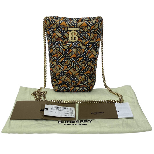 Bolsa Burberry Lola Bucket. O modelo é confeccionado em couro com estampa de logotipos da marca. Traz alça longa em corrente, ferragens douradas e logotipo aplicado em metal na parte frontal.