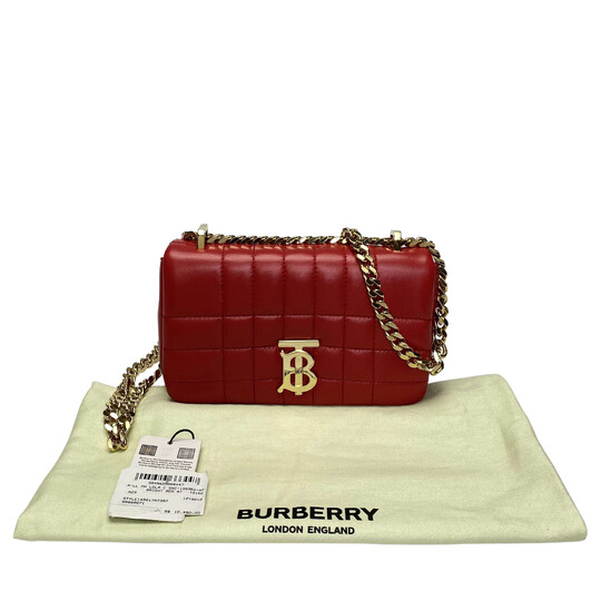 Bolsa Burberry Lola confeccionada em couro liso na cor vermelha. O modelo de tamanho mini possui alça de corrente, ferragens douradas e apresenta o monograma Thomas Burberry.
