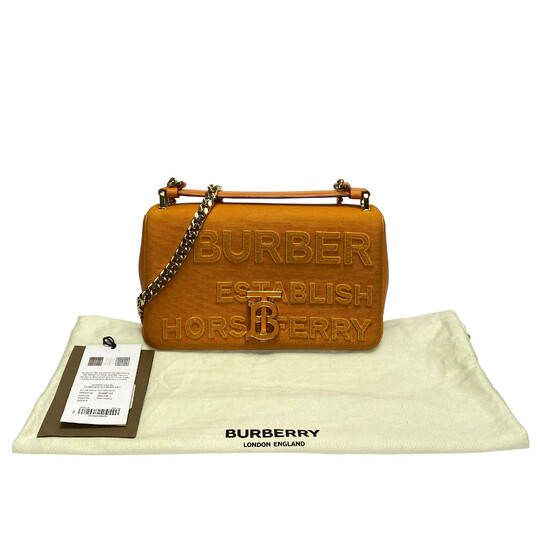 Bolsa Burberry Lola Horseferry confeccionada em canvas na cor laranja com acabamentos em couro laranja. O modelo de tamanho pequeno e formato retangular traz uma alça de mão estruturada, outra de ombro em corrente, ferragens douradas e detalhe de logotipo da marca aplicado na parte frontal.