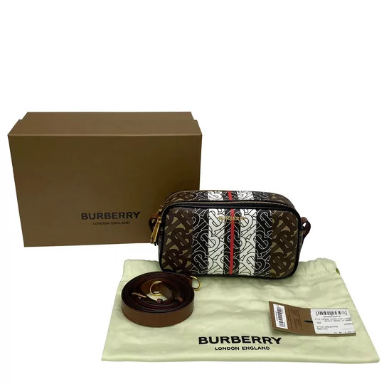 Bolsa Burberry Micro Camera confeccionada em canvas com estampa digital de monograma da marca e de listras, e detalhes em couro. Com ferragens dourada, apresenta dois compartimentos fechados por zíper e alça longa ajustável e removível.