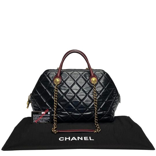 Bolsa Chanel Castle Rock Bowling confeccionada em couro glazed calfskin na cor preta com alça em vinho. O modelo possui acabamento em matelassê, compartimento único, três bolsos internos sendo um com fecho em zíper e tira de couro interna com mosquetão. Traz ferragens em ouro envelhecido, alça dupla de mão estruturada , alça dupla de ombro em corrente com apoio em couro e fecho por zíper com chaveiro com a logotipo da marca.