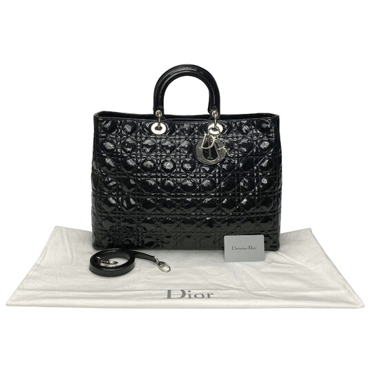 Bolsa Christian Dior Lady Dior Grande. O modelo de formato retangular é confeccionado em couro envernizado e traz acabamento matelassê. Possui alça dupla de mão estruturada, outra longa removível por mosquetão, fechamento por zíper, compartimento único e ferragens prateadas.