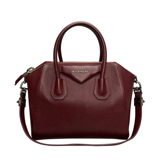 Bolsa Givenchy Antigona confeccionada em couro na cor vinho. O modelo retangular pequeno estruturado possui compartimento único amplo com fecho principal por zíper, três bolsos internos, alça dupla estruturada de mão, alça única de ombro e ferragens prateadas.