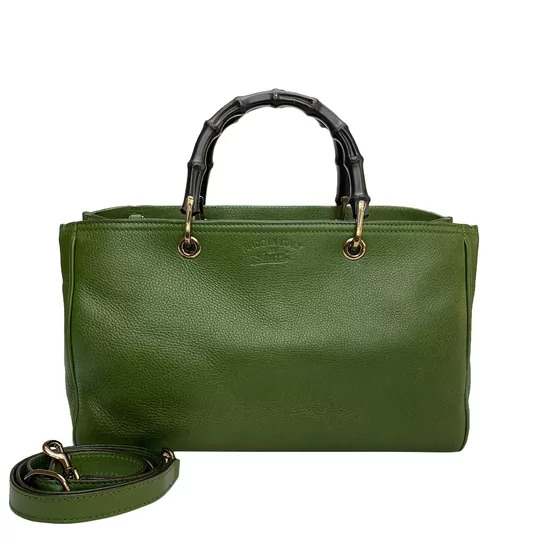 Bolsa Gucci Bamboo Shopper. Confeccionada em couro na cor verde, possui modelagem retangular, alça dupla de mão em bamboo e outra longa de ombro ajustável por fivela e removível por mosquetão. Com ferragens prateadas, conta com três compartimentos sendo o central com fecho por zíper e quatro bolsos. Fecho principal por botão magnético.