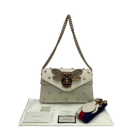 Bolsa Gucci Broadway Abelha confeccionada em couro na cor off white. O modelo possui maxi abelha esmaltada com aplicação de pérolas sintéticas e pedrarias na cor vermelha na parte frontal. Conta com uma alça de ombro em corrente, outra removível em gorgurão nas cores azul, vermelha e branca, um bolso na parte interna, ferragens em dourado e fecho por botão magnético.