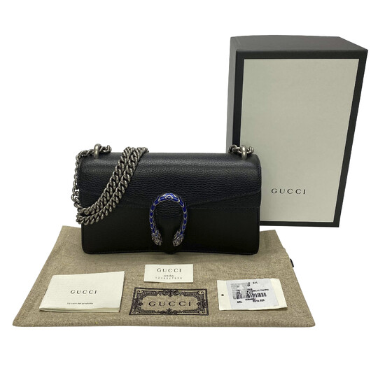 Bolsa Gucci Dionysus confeccionada em couro na cor preta. O modelo possui formato retangular pequeno, alça dupla em corrente prateada, que pode ser usada também como única, e quatro compartimentos internos, sendo um com fecho por zíper e outro por botão de pressão. Apresenta fechamento principal por aba com dispositivo de encaixe e detalhe de ferragem de tigre dourado com pedras azuis.