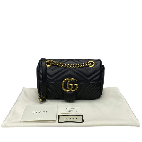 Bolsa Gucci GG Marmont Mini. O modelo confeccionado em couro chevron na cor preta possui formato levemente estruturado e fechamento por aba oversized com ferragem Duplo G em tom dourado envelhecido. Apresenta detalhe de coração na parte posterior, bolso interno, alça de ombro ajustável de 55 cm que também pode ser usada como uma alça de mão com 30 cm.