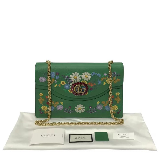 Bolsa Gucci Ricami Bordada. Confeccionada na Itália em couro verde, o modelo de tamanho grande possui alça de ombro em corrente dourada, parte superior dobrável com fecho de pressão e logo 'Duplo G' com aplicações de cristais. Além disso, apresenta bordado floral multicolorido e detalhe de um gatinho na parte detrás.