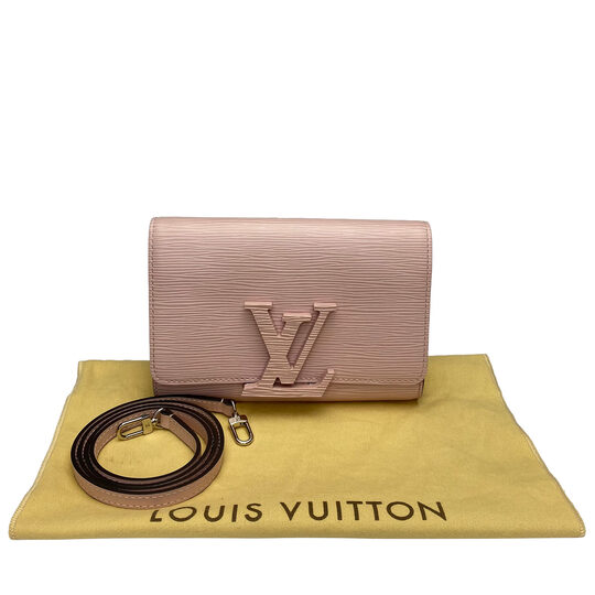 Bolsa Louis Vuitton Louise PM confeccionada em couro Epi na cor rosa. Possui fecho monograma LV e abertura "flip", com interior revestido em tecido aveludado, dois espaços para armazenar cartões, um bolso com zíper e um frontal aberto. Apresenta alça longa removível em couro, que pode transformá-la em uma clutch de festa.