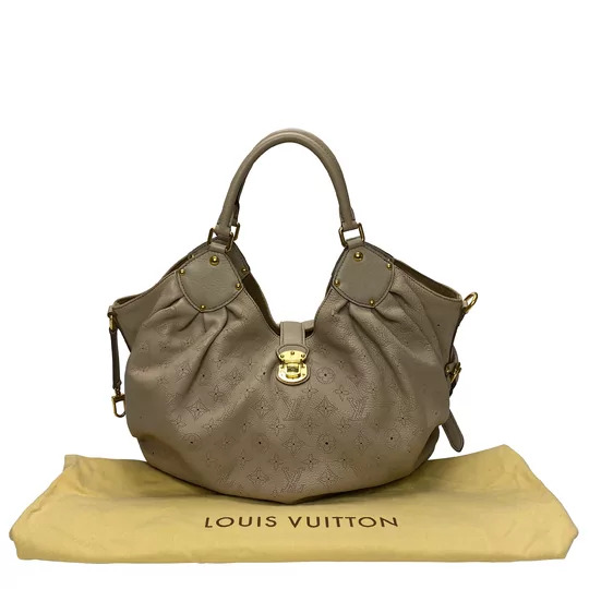 Bolsa Louis Vuitton Mahina XL confeccionada em couro na cor cinza. O modelo retangular grande possui alça dupla, ferragens douradas, ajustes nas laterais, compartimento único com bolso interno com fecho em zíper e fecho principal em dispositivo de encaixe. Date Code: TJ4191