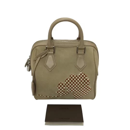 Bolsa Louis Vuitton Mini Speedy Printemps-Été. O modelo confeccionado em camurça na cor bege com detalhe frontal em tons de branco e marrom, apresenta duas alças de mão, bolso interno, ferragens prateadas e fecho principal em zíper.