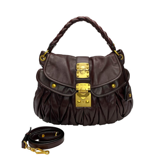 Bolsa Miu Miu Coffer confeccionada em couro matelassê na cor vinho. O modelo grande possui alça de mão trançada, alça de ombro removível, dois bolsos frontais, dois internos, ferragens em metal dourado e fecho por aba com dispositivo de encaixe. Conta com drapeados na parte inferior, marca em baixo relevo na parte frontal e ferragem na parte posterior.