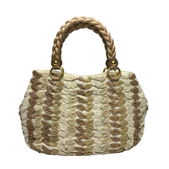 Bolsa Miu Miu Intreccio Woven confeccionada em couro na cor nude, com detalhes em bege e caramelo. O modelo de formato arredondado traz duas alças de ombro, ferragens douradas e compartimento único interno. Fechamento principal por botão de pressão.