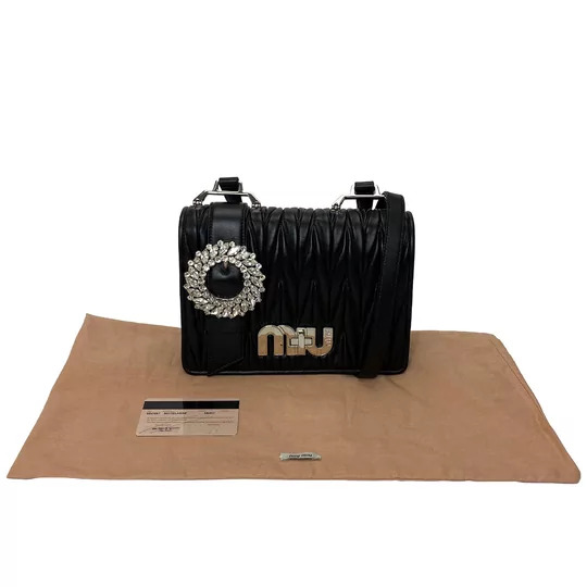 Bolsa Miu Miu 'Miu Crystal' Tiracolo. O modelo pequeno é confeccionado em couro matelassê preto e possui ferragens prateadas. Com alça em corrente, parte superior dobrável com fecho de encaixe e compartimento interno, o destaque da peça fica por conta do detalhe de fivela com aplicação de cristais.