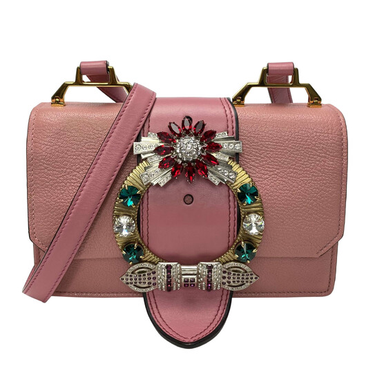 Bolsa Miu Miu confeccionada em couro na cor rosa com ferragens douradas e detalhe de pedrarias aplicadas na parte frontal. O modelo de tamanho pequeno traz uma alça longa ajustável, fechamento por botões de pressão, e compartimento único interno.