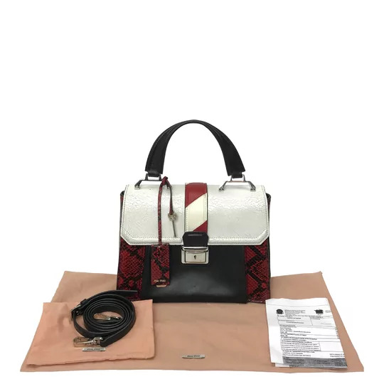 Bolsa Miu Miu confeccionada em couro nas cores preto, off white e vermelho, com detalhes em couro de píton preto e vinho. O modelo possui uma alça de mão e outra auxiliar, removível por mosquetão. O destaque fica por conta do aspecto craquelado do couro, na parte off white. Com ferragens prata e fecho por dispositivo de encaixe, traz detalhe de metal prateado com nome da marca na parte traseira.