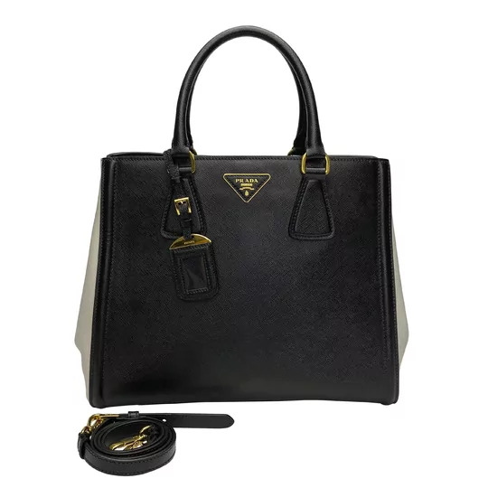 Bolsa Prada Galleria Bicolor. Confeccionada em couro saffiano nas cores preta com detalhes em off white. O modelo retangular possui tamanho médio, três compartimentos com quatro bolsos internos, sendo um com fecho em zíper. Conta com alça dupla de mão, alça longa auxiliar removível por mosquetão, ferragens douradas, botões laterais para ajuste, nome da marca na parte frontal e fecho principal em zíper no compartimento central e posterior.