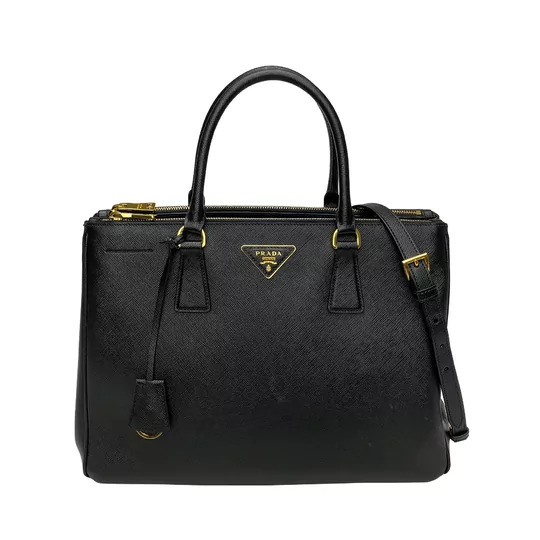 Bolsa Prada Galleria Saffiano Medium. Confeccionada em couro saffiano na cor preta, o modelo retangular médio estruturado, possui três compartimentos, sendo somente os de ambas laterais com fecho por zíper. Conta com quatro bolsos internos, alça dupla de mão e alça única de ombro ajustável por fivela e removível por mosquetão. Botões de pressão em ambas extremidades para expansão de espaço e ferragens douradas.