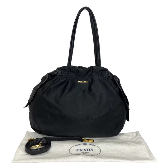 Bolsa Prada confeccionada em nylon na cor preta. O modelo de tamanho grande possui alça dupla de mão, alça única de ombro regulável e removível por mosquetão, ferragens douradas e detalhe nas laterais de laço em couro. Conta com dois bolsos internos, sendo um em fecho por zíper. Fecho principal por botão de pressão.