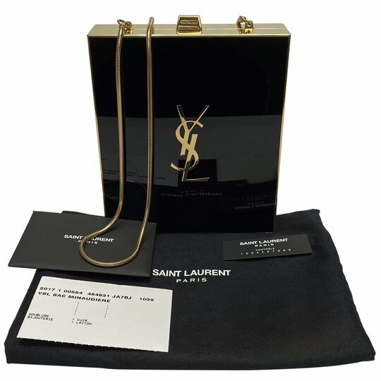 Bolsa Saint Laurent Tuxedo Box. O modelo é confeccionado em resina preta com ferragens douradas. Traz alça de ombro que pode ser colocada dentro da bolsa, transformando-a em clutch, fecho por encaixe e logo da marca grande na parte frontal.