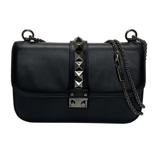 Bolsa Valentino Glam Lock confeccionada em couro na cor preta. O modelo possui alça única de ombro em corrente, que pode ser usada como dupla, detalhe em maxi studs na aba frontal e conta com três bolsos internos sendo um com fecho por zíper. Fecho principal por dispositivo de encaixe.