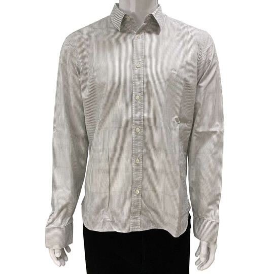 Camisa Burberry confeccionada 100% em algodão na cor off white com listras cinza. Possui manga longa e fechamento por botões. Tamanho: L