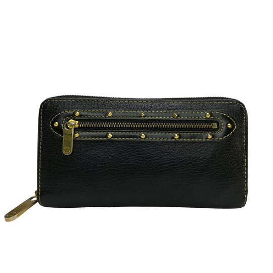 Carteira Louis Vuitton confeccionada em couro na cor preta. O modelo retangular apresenta fechamento por zíper, ferragens douradas e bolso externo com detalhe de taxinhas. Em seu interior traz 14 compartimentos para cartões de crédito, dois para documentos no geral e um com zíper para moedas.
