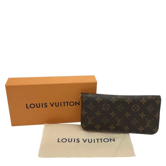 Carteira Louis Vuitton Insolite Monograma confeccionada em canvas, com acabamentos em couro vermelho. O modelo retangular possui dois compartimentos internos com fecho em zíper, doze divisórias para cartões e três compartimentos para dinheiro. Ferragens douradas e argola para encaixe na lateral esquerda. Apresenta iniciais: A.C.L
