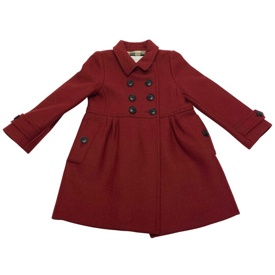 Casaco Burberry Infantil confeccionado em lã na cor vermelha. O modelo de formato alongado apresenta fechamento frontal por botões e dois bolsos externos. Tamanho: 2 anos / 92 cm