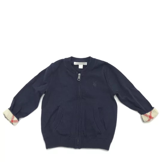 Casaqueto Infantil Burberry na cor azul marinho. A peça possui zíper na parte da frente e bolsos para as mãos. Nas mangas, aparece a estampa xadrez clássica da marca.