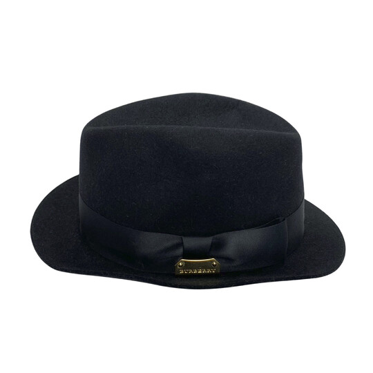 Chapéu Burberry com detalhe de faixa e laço em cetim e plaquinha em metal dourado com nome da marca gravado em baixo relevo. Tamanho: S.