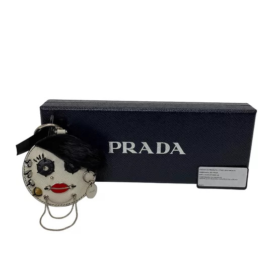 Chaveiro Prada confeccionado em metal prateado com um espelho redondo localizado na parte detrás. A peça possui trecho em couro off white no tipo saffiano com detalhes formando um rosto de rockeiro. O chaveiro conta ainda com uma tira de couro saffiano off white com fivela.
