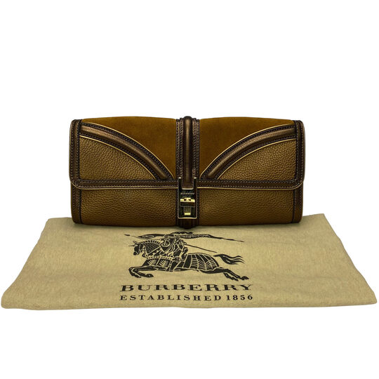 Clutch Burberry confeccionada em couro com acabamentos em camurça nas cores caramelo e marrom metalizado. O modelo de tamanho grande apresenta fechamento por botões de pressão e dispositivo de encaixe. Com ferragens dourada, apresenta bolso interno com zíper.