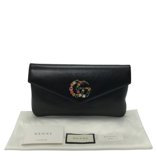 Clutch Gucci confeccionada em couro na cor preta. O modelo envelope tem como destaque o duplo GG cravejado de cristais coloridos na parte frontal. Com fechamento por botão de pressão, traz um bolso com zíper em seu interior.