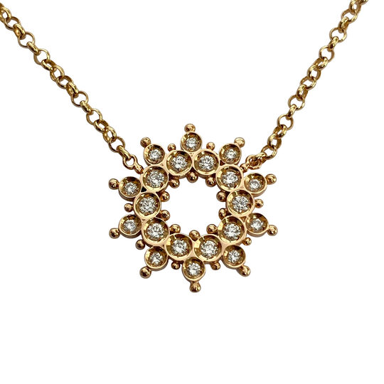 Colar Carla Amorim Balneário. Uma das peças da coleção Maresias, ele é confeccionado em ouro rosa 18k, com acabamento polido e com brilhantes. Os diamantes formam um belo desenho com inspiração navy. Diâmetro do pingente: 18mm.