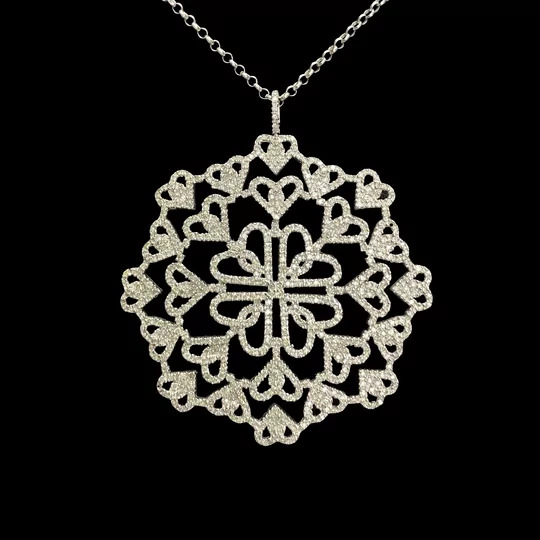 Colar Mandala Vivara, integrante da coleção Romance. O modelo é confeccionado em ouro branco 18k com pingente cravejado de diamantes. Tamanho: 40 cm (corrente) / 5 cm (pingente).