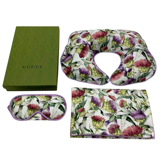 Kit Viagem Gucci confeccionado em tecido floral e composto por bolsinha, tapa-olhos e almofada para pescoço inflável.