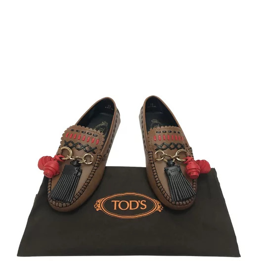 Mocassim Tod's confeccionado em couro na cor caramelo. O modelo possui bico arredondado, detalhe de ferragem dourada com penduricalhos em couro na parte frontal e acabamento em pespontos vermelho e preto.