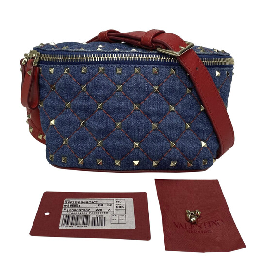 Pochete Valentino Garavani confeccionada em tecido denin com acabamentos em couro vermelho. O modelo possui alça de cintura ajustável, rockstuds dourados aplicados por toda a peça, fechamento principal por zíper e bolso interno.