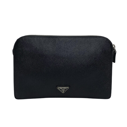 Porta-Documentos Prada confeccionado em couro saffiano na cor preta. O modelo de tamanho grande traz um bolso externo, outro interno, ferragens prateadas e fechamento principal por zíper. Plaquinha com logo da marca na parte frontal.