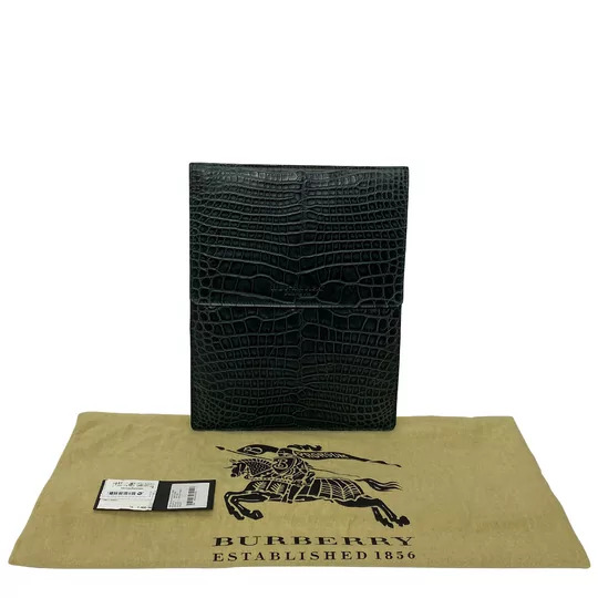 Porta-Ipad Burberry confeccionado em legítimo couro de crocodilo no tom verde escuro. A peça possui textura do couro e inscrição da marca em baixo relevo.