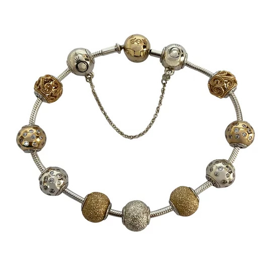 Pulseira Pandora com Berloques em Ouro e Prata pandora Moda plus size original brechó desapego desapego de luxo segunda mão second hand usado usado e bom estado conservado bolsas usadas bolsas segunda mao etiqueta unica enjoei peguei bode bolsas conservadas cansei vendi troca de luxo