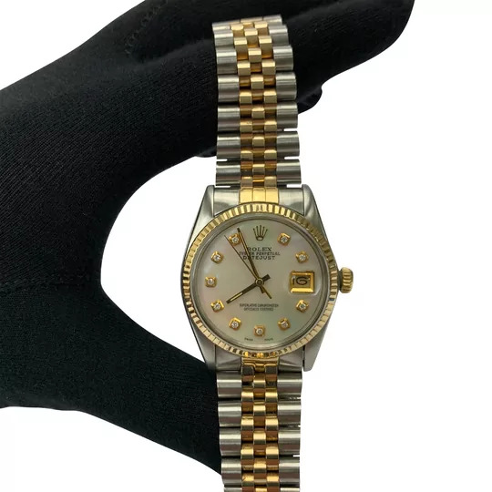 Relógio Rolex Oyster Perpetual Datejust 36. O modelo automático é confeccionado em aço e ouro amarelo, com fundo em madrepérola e 10 diamantes. Ano de fabricação: 1.985