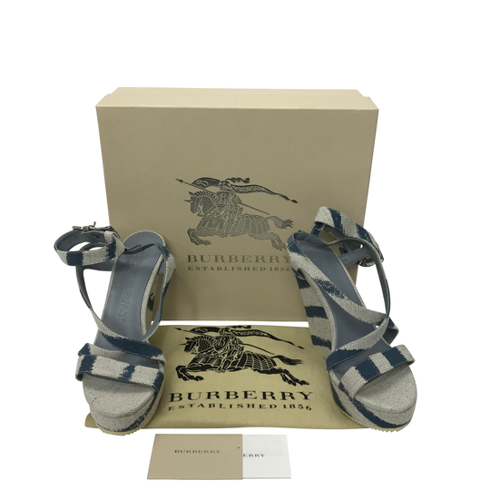 Sandália Burberry tipo anabela confeccionada em tecido nas cores azul e off white. O modelo possui fecho em fivela prateada que prende no tornozelo, solado emborrachado e plaquinha metálica identificando a marca na parte detrás da peça.