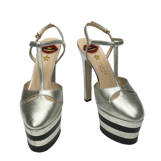 Sandália Gucci Angel confeccionada em couro na cor prata, com detalhes em preto. Com bico arredondado e salto alto, o modelo apresenta plataforma meia pata, tira no calcanhar e fechamento por fivela.