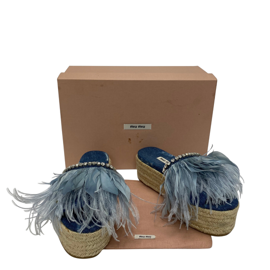 Sandália Miu Miu. O modelo revestido em tecido jeans, é coberto por penas na cor azul e possui detalhe de cristais. Com solado em borracha, conta com salto em sisal.