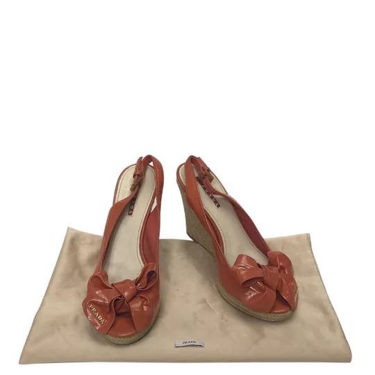 Sandália Prada Anabela confeccionada em couro envernizado laranja. O modelo possui salto anabela em sisal bege, laço na parte frontal e fecho por fivela na parte posterior. Conta com nome da marca em dourado no laço.