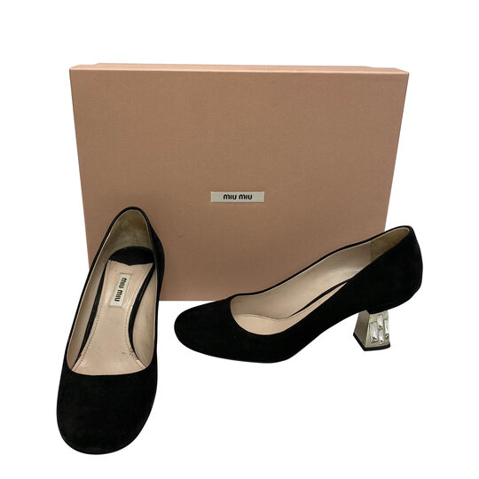 Sapato Miu Miu confeccionado em camurça na cor preta. O modelo possui bico arredondado e salto baixo quadrado grosso com aplicação de cristais.